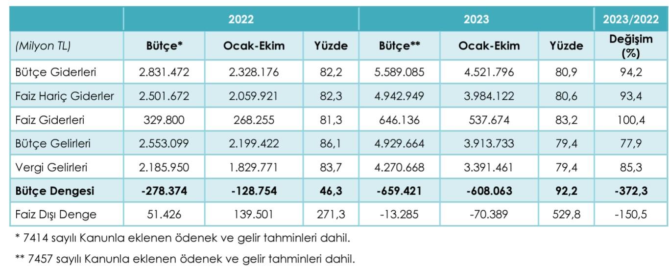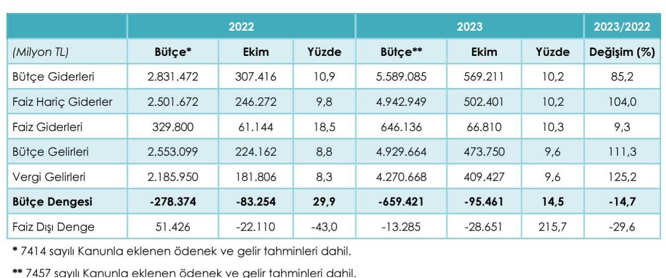 Bütçe gelirleri ekimde 473 milyar 750 milyon lira, giderleri 569 milyar 211 milyon lira olarak hesaplandı. Bütçe açığı ekimde 95 milyar 461 milyon lira, ocak-ekim döneminde ise 608 milyar 63 milyon lira oldu.