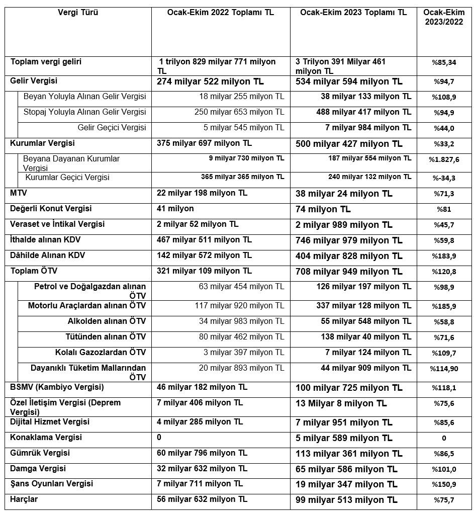 Vergi türleri itibarıyla ocak-ekim döneminde geçen yılın aynı dönemine göre gelir vergisi yüzde 94,7, kurumlar vergisi 33,2, dahilde alınan katma değer vergisi yüzde 183,9, özel tüketim vergisi yüzde 120,8, banka ve sigorta muameleleri vergisi yüzde 118,1, ithalde alınan katma değer vergisi yüzde 59,8, damga vergisi yüzde 101, harçlar yüzde 75,7 ve diğer vergi gelirleri yüzde 103,6 arttı.