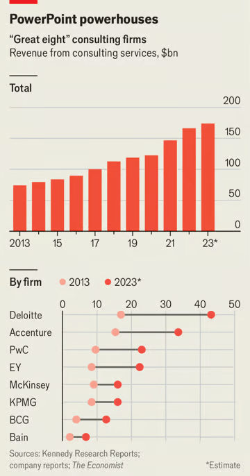 Kısa bir süre önce danışmanlık sektörü yıkılmaz görünüyordu. Müşteriler işlerini dijitalleştirme, tedarik zincirlerini çeşitlendirme ve çevresel, sosyal ve yönetişim kimliklerini güçlendirmek için artan çağrılara yanıt verme çabalarını hızlandırdıkça, özellikle çaresizliğin arttığı pandemi sırasında ücretler roket gibi yükseldi. Strateji danışmanları üçlüsü (Bain, BCG ve McKinsey), “dört büyük” muhasebe devi (Deloitte, EY, KPMG ve PWC) ve Accenture (aynı zamanda dünyanın en büyük dış kaynak sağlayıcısı) dahil olmak üzere sektörün en önemli firmalarının danışmanlık gelirleri 2021’de yüzde 20, 2022’de ise yüzde 13 oranında arttı.