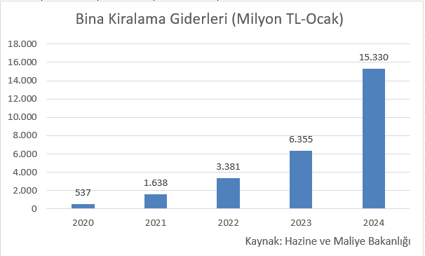 Yüksek enflasyon kamunun kira ödemelerini de vurdu. CHP Milletvekili Ateş ' 2023 Ocak'ta 6 milyar 335 milyon lira olan kira ödeyen merkezi yönetimin bina kiralama giderleri bu yıl ocakta yüzde 141 artarak 15 milyar 320 milyon liraya ulaştı' dedi.