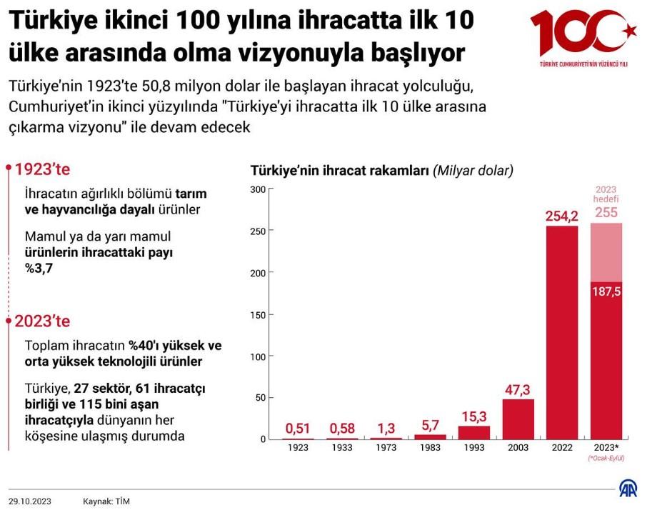 Türkiye'nin 1923'te 50,8 milyon dolarlık küçük bir adımla başlayan ihracat yolculuğunda bu yıl hedef 255 milyar dolar. TİM Başkanı Mustafa'ya Gültepe'ye göre gelecekteki hedef ise dünyadaki ilk 10 ülke arasına girmek.