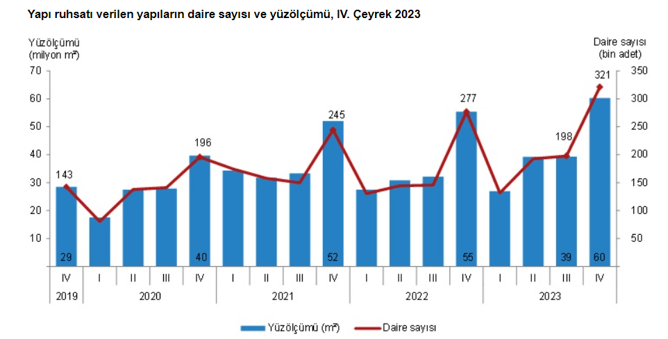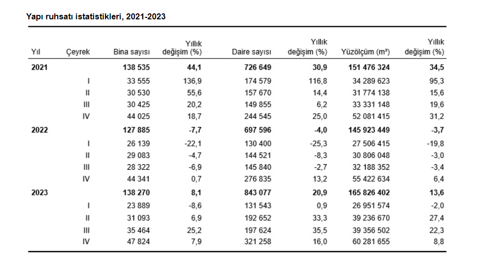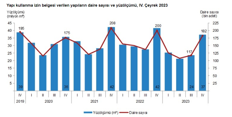 Son çeyrekte yapı ruhsatı verilen yapıların kullanma amacına göre en yüksek yüzölçüm payına 42,9 milyon m2 ile iki ve daha fazla daireli ikamet amaçlı binalar sahip oldu. Bunu 4,3 milyon m2 ile bir daireli binalar izledi. Bir önceki yılın aynı çeyreğine göre, 2023 yılı son çeyreğinde belediyeler tarafından yapı kullanma izin belgesi verilen yapıların bina sayısı yüzde 7,0, daire sayısı yüzde 8,9 ve yüzölçümü yüzde 10,5 azaldı.