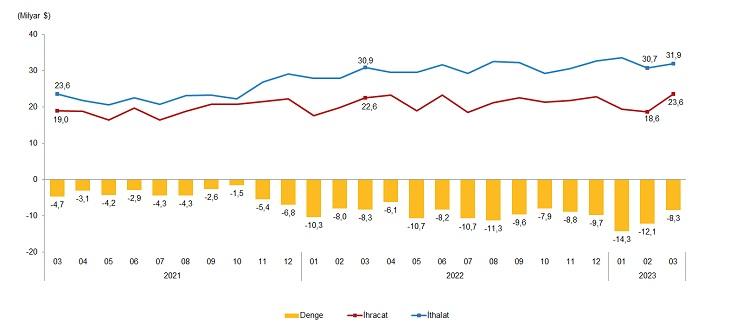 Mart ayında dış ticaret açığı geçen yılın aynı ayına göre yüzde 0,9 artarak 8 milyar 341 milyon dolara yükseldi. Ocak-mart döneminde dış ticaret açığı ise geçen yılın aynı dönemine göre yüzde 30,7 artarak 34,6 milyar dolara yükseldi.