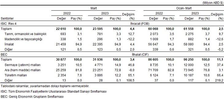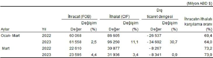 Türkiye İstatistik Kurumu (TÜİK), mart ayına ilişkin dış ticaret verilerini açıkladı. Buna göre, ihracat mart ayında geçen yılın aynı ayına göre yüzde 4,4 artarak 23 milyar 595 milyon dolar, ithalat yüzde 3,4 artarak 31 milyar 936 milyon dolar olarak gerçekleşti. İhracat yılın ilk 3 ayında geçen yılın aynı dönemine göre yüzde 2,5 artarak 61 milyar 558 milyon dolar, ithalat yüzde 11,1 artarak 96 milyar 250 milyon dolara çıktı. Martta dış ticaret açığı geçen yılın aynı ayına göre yüzde 0,9 artarak 8 milyar 267 milyon dolardan, 8 milyar 341 milyon dolara yükseldi. Ocak-mart döneminde ise yüzde 30,7 artarak 26 milyar 537 milyon dolardan 34 milyar 692 milyon dolara yükseldi.