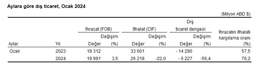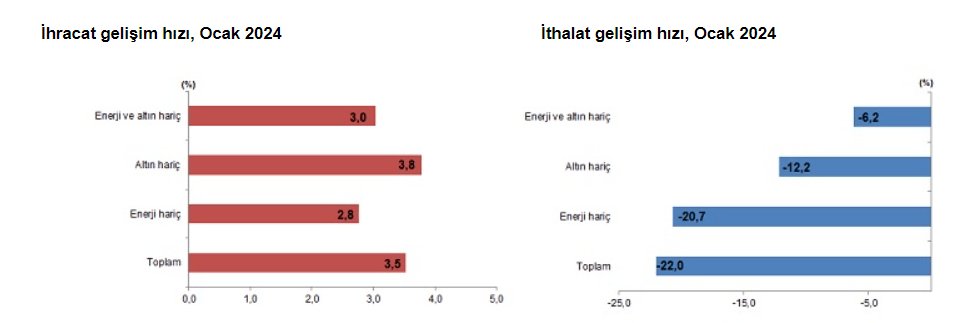 Enerji ürünleri ve parasal olmayan altın hariç ihracat 2024 Ocak ayında yüzde 3,0 artarak 18 milyar 44 milyon dolardan 18 milyar 592 milyon dolara yükseldi. Ocak ayında enerji ürünleri ve parasal olmayan altın hariç ithalat yüzde 6,2 azalarak 19 milyar 886 milyon dolardan 18 milyar 660 milyon dolara geriledi. Enerji ürünleri ve parasal olmayan altın hariç dış ticaret açığı Ocak ayında 68 milyon dolar olarak gerçekleşti. Dış ticaret hacmi yüzde 1,8 azalarak 37 milyar 251 milyon dolar olarak gerçekleşti. Söz konusu ayda enerji ve altın hariç ihracatın ithalatı karşılama oranı yüzde 99,6 oldu. Ekonomik faaliyetlere göre ihracatta 2024 Ocak ayında imalat sanayinin payı yüzde 93,0; tarım, ormancılık ve balıkçılık sektörünün payı yüzde 5,0, madencilik ve taş ocakçılığı sektörünün payı yüzde 1,5 oldu.