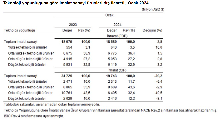Ocak ayında imalat sanayi ürünlerinin toplam ihracattaki payı yüzde 93,0, yüksek teknoloji ürünlerinin imalat sanayi ürünleri ihracatı içindeki payı yüzde 3,5 oldu. Yüksek teknolojili ürünlerin ihracatı ocakta yüzde 16 artarken ithalatın ise yüzde 6.4 azaldığı dikkat çekti.