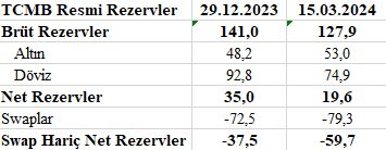Bu arada TCMB rezervlerinde yerel seçim öncesindeki düşüş eğilimi geçen hafta da devam etti. TCMB’nin brüt rezervi geçen hafta 2,6 milyar dolarlık düşüşle 127,9 milyar dolara geriledi. 22 Aralık 2023’te 145,5 milyar dolarla rekor kıran brüt rezervler son 11 haftada toplam 17,6 milyar dolar gerilemiş oldu. Net rezerv geçen hafta 1,2 milyar dolarlık düşüşle 19,6 milyar dolara indi. Böylece son 11 haftada net rezervlerdeki düşüş 20,5 milyar dolara ulaştı. Swap hariç net rezerv geçen hafta 5,8 milyar dolarlık düşüşle -59,7 milyar dolara geriledi. Son 11 haftada swap hariç net rezervlerdeki düşüş 23,3 milyar dolar oldu.