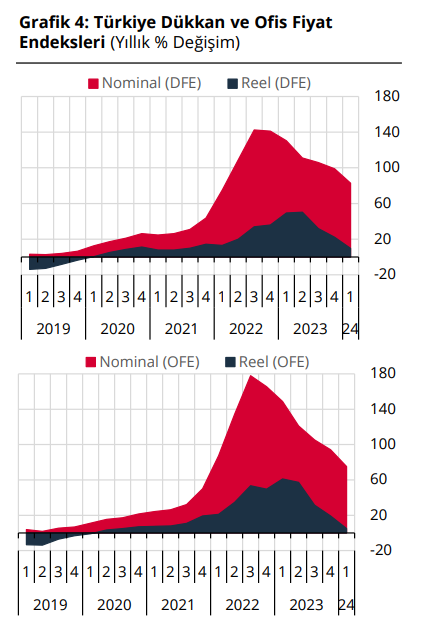 İlk çeyrekte bir önceki çeyreğe göre yüzde 13 artan ofis fiyat endeksi ise 2023’ün aynı dönemine göre nominal yüzde 75,1, reel olarak da yüzde 5 artış gösterdi.