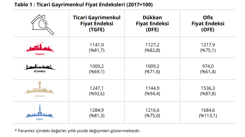 Üç büyük il için ticari gayrimenkul fiyat endeks değişimine bakıldığında fiyatlar 2024'ün 1. çeyreğinde bir önceki çeyreğe göre İstanbul'da yüzde 11,2 Ankara'da yüzde 13,1 İzmir'de ise yüzde 11,4 yükseldi. Konutun getirisi enflasyonun altında kalırken, ofis ve dükkan yatırımcısına kazandırmaya devam ediyor. Uzun zamandır yeni arzın sınırlı üretilmesi ve pandemi sonrası işyerine yeniden dönüşün başlamasıyla ofis ve dükkan binalarına talep artışa geçti. Türkiye Cumhuriyet Merkez Bankası’nın (TCMB) yayınladığı ticari gayrimenkul fiyat endeksine (TGFE) göre ticari gayrimenkul fiyatları 2024’ün ilk çeyreğinde bir önceki çeyreğe göre yüzde 12, yıllık bazda nominal yüzde 81,7 ve reel olarak yüzde 8,9 arttı. Türkiye genelinde ilk çeyrekte bir önceki çeyreğe göre yüzde 11,7 artan dükkan fiyat endeksi, önceki yılın aynı dönemine göre nominal yüzde 82,8 ve reel olarak da yüzde 9,6 yükseldi.