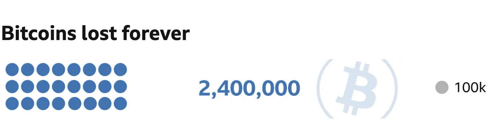 Genellikle üstünde mutabık kalınan tahmin bu sayının 3,5 milyon olduğu. Ancak bu atıl coinlerin 1,1 milyonunun Bitcoin’in anonim yaratıcısına ait olması muhtemel olduğu için bu rakamı sonsuza kadar kayıp Bitcoin sayısından düşmek mümkün. Bu nedenle kayıp Bitcoin’ler için yapılacak muhafazakar bir tahmine göre sayı 2,4 milyon ya da tüm Bitcon’lerin yüzde 11’i.