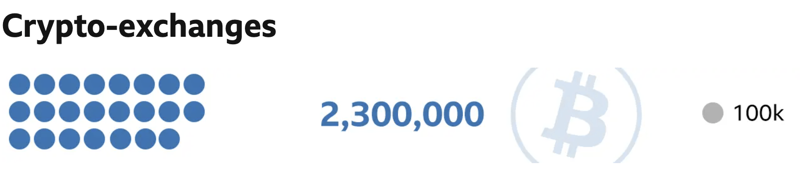 Kripto para borsaları kripto kullanıcıları için banka gibi hareket eder. Dolar ya da sterlin gibi geleneksel paralarınızı Bitcoin ve diğer dijital tokenlerle değiştirebilirsiniz. K33 araştırmacıları yaklaşık 2,3 milyon bitcoin’in borsalar tarafından müşteri adına tutulduğunu tahmin ediyor. Dünyanın en büyük borsası Binance’in yaklaşık 550,000 Bitcoine sahip olduğu tahmin ediliyor. Onu 403,00 ile Bitfinex, 386.000 ile Coinbase, 146.000 ile Robinhood ve 126,000 ile OKX takip ediyor. Borsaların tüm Bitcoinlerin yaklaşık yüzde 11’ini tuttuğu düşünülüyor.