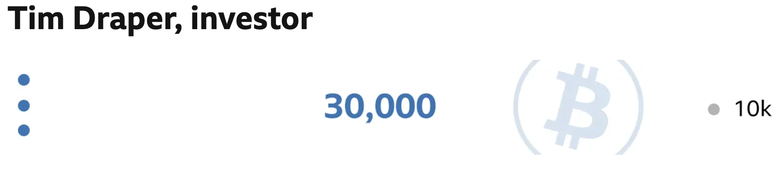 ABD’li risk sermayesi yatırımcısı Tim Draper 2014 yılında polis tarafından Silk Road’dan ele geçirilen ve ABD hükümeti tarafından açık arttırmaya çıkarılan 30,000 bitcoini satın aldığında manşetlere çıkmıştı. O dönemde bu yatırım ona 17 milyon dolara mal olmuştu. Şu anda kaç Bitcoin’e sahip olduğunu açıklamasa da 2022’de kripto web sitesi Protos’a hiç satmadığını ve hala bitcoin satın aldığını söyledi. Bu nedenle elinde tuttuğu Bitcoin sayısının hayli arttığını söylemek mümkün.