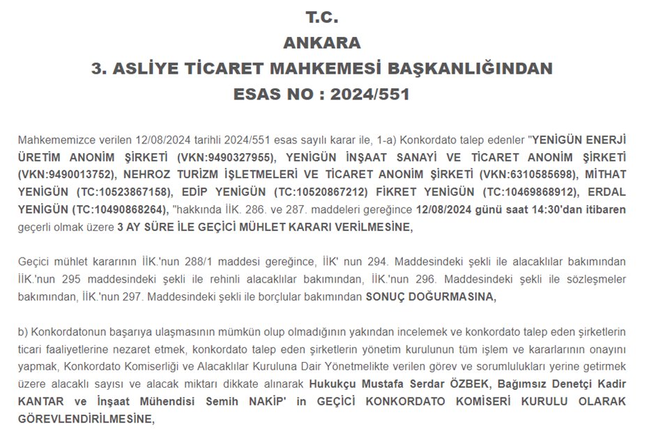 Halktv.com.tr’nin haberine göre, Ankara 3. Asliye Ticaret Mahkemesi, Yenigün İnşaat AŞ ve Yenigün Enerji Üretim AŞ için 3 aylık geçici mühlet kararı verdi. Bu süre zarfında şirketlere yönelik haciz işlemleri durdurulacak ve bir komiser heyeti şirketin faaliyetlerini denetleyecek.