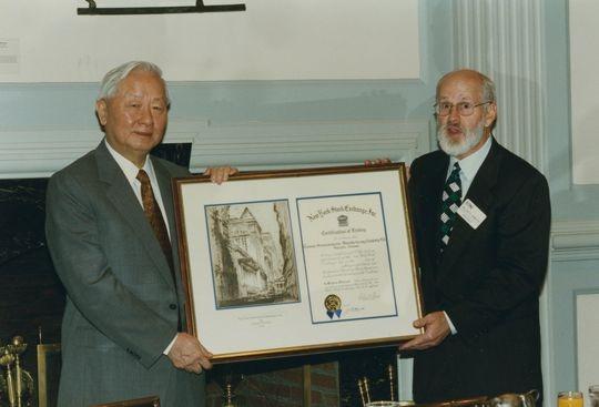 Morris Chang TSMC’nin New York Borsası’nda halka açıldığı gün dünyanın en büyük borsasının o zamanki başkanı William Johnston ile bu pozu vermişti.