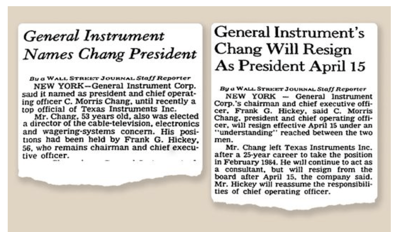 The Wall Street Journal, Chang’ın General Instrument’a gelişini ve ayrılışını böyle duyurmuştu.