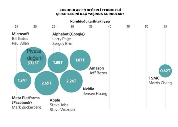 Morris Chang, dünyanın en değerli şirketi olabilecek potansiyele sahip Taiwan Semiconductor Manufacturing Company'i 55 yaşındayken kurdu. Dünyanın en değerli teknoloji şirketlerinin çoğu genç girişimciler tarafından yurt odalarında, evlerin garajlarında ve lokantalarda kurulduğu bilinir. Bill Gates Microsoft’u kurduğunda 19 yaşındaydı. Steve Jobs, Apple’ı 21 yaşında kurmuştu. Bugün ABD’nin en büyük piyasa değerine sahip iki şirketi olan Amazon ve Nvidia’nın kurucuları Jeff Bezos ve Jensen Huang girişimlerine başladığında 30 yaşındaydı.