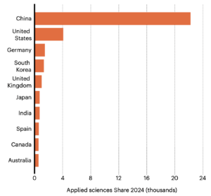 Sıralamaya dahil edilen uygulamalı bilimler çıktısının %56’sına Çin merkezli araştırmacılar katkıda bulundu ve bu oran 22.261’dir (Nature Index metriği olan Pay, araştırma makalelerinin yazarlıklarının kesirli bir sayımıdır). Amerika Birleşik Devletleri, 4.099’luk payla ikinci sırada yer alıyor ve bu da 2024 yılında uygulamalı bilimler araştırmalarının %10’unu temsil ediyor. Uygulamalı bilimlerde önde gelen on araştırma kurumu da Çin merkezli.