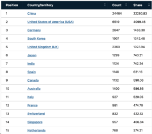 Özellikle Çin, teknoloji, bilişim ve yapay zeka için küresel bir merkez olmak gibi ekonomik hedeflerine uygun araştırmaları kasıtlı olarak destekliyor. Örneğin, ülke elektrikli otomobillerin geliştirilmesinde ana merkez haline geldi ve küresel üretimin %70’ini karşılıyor. 2014 ile 2023 yılları arasında Çin merkezli mucitler 38.000’den fazla üretken yapay zeka patenti başvurusunda bulundu; bu sayı, Amerika Birleşik Devletleri merkezli mucitlerin başvurusunun altı katı.