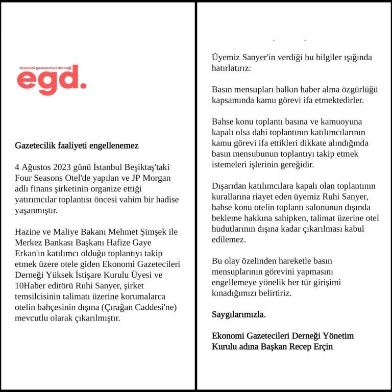 Ekonomi Gazeteciler Derneği tarafından yapılan “Gazetecilik faaliyeti engellenemez” başlıklı açıklama, “Dışarıdan katılımcılara kapalı olan toplantının kurallarına riayet eden üyemiz Ruhi Sanyer, bahse konu otelin toplantı salonunun dışında bekleme hakkına sahipken, talimat üzerine otel hudutlarının dışına kadar çıkarılması kabul edilemez” denildi.