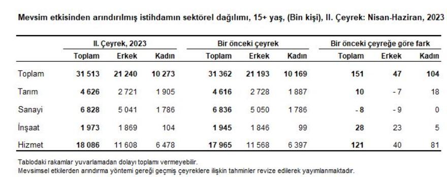 İstihdam edilenlerin sayısı 2023 yılı ikinci çeyreğinde bir önceki çeyreğe göre 151 bin kişi artarak 31 milyon 513 bin kişi, istihdam oranı ise 0,1 puanlık artışla yüzde 48,2 oldu. Bu oran erkeklerde yüzde 65,7 iken kadınlarda yüzde 31,1 olarak gerçekleşti. Yaratılan yeni istihdamda kadınlar 104 bin ile erkeklere büyük fark atarken, hizmet sektörü 81 bin ile en fazla istihdam yaratan sektör oldu. Bu sektörde de yeni istihdamda kadınlar erkekleri geride bıraktı. İnşaat sektörü ise yavaşlamaya rağmen 23 bini erkek, 5 bini kadın olmak üzere toplam 28 bin kişiye istihdam yarattı. Sanayi sektöründe ise aynı dönemde istihdam yaratılması bir yana 8 bin kişi işini kaybetti.