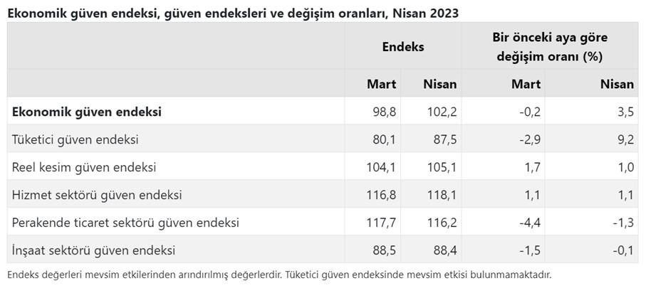 Nisan ayında Tüketici Güven Endeksi bir önceki aya göre 9,2 puan artarak 87,5 değerini, reel kesim (imalat sanayi) güven endeksi yüzde 1,0 oranında artarak 105,1 değerini, hizmet sektörü güven endeksi yüzde 1,1 oranında artarak 118,1 değerini aldı. Perakende ticaret sektörü güven endeksi yüzde 1,3 oranında azalarak 116,2 değerini, inşaat sektörü güven endeksi yüzde 0,1 oranında azalarak 88,4 şeklinde kaydedildi.