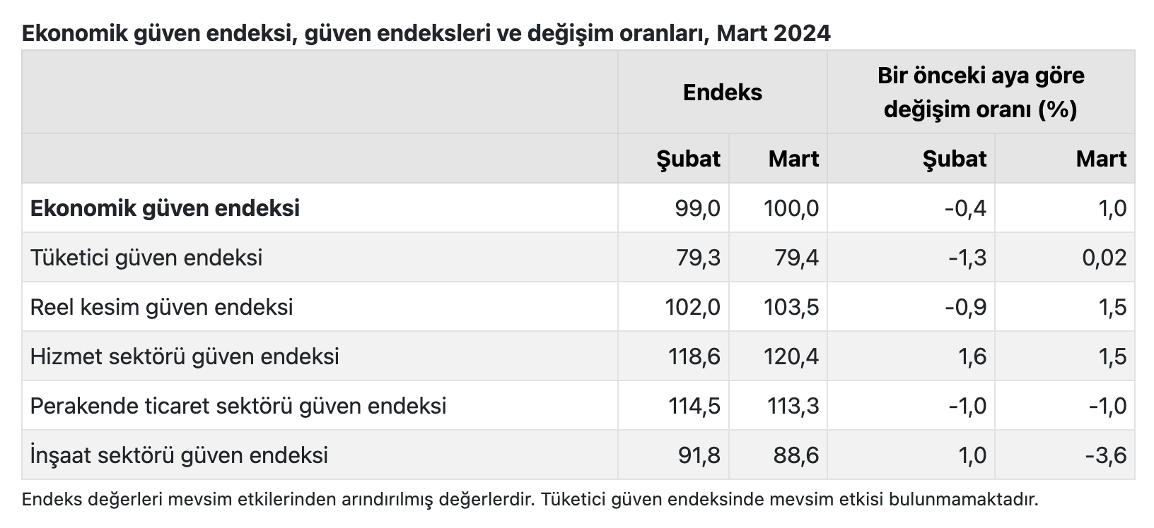 Ekonomik güven endeksi martta hafif bir artışla 'iyimserlik sınırı'na dayandı. Yükselişte reel kesim ve hizmet sektörü güven endekslerindeki artış etkili oldu. Perakende ticaret ve inşaat güven endekslerinde ise yüksek oranlı düşüşler göze çarpıyor.