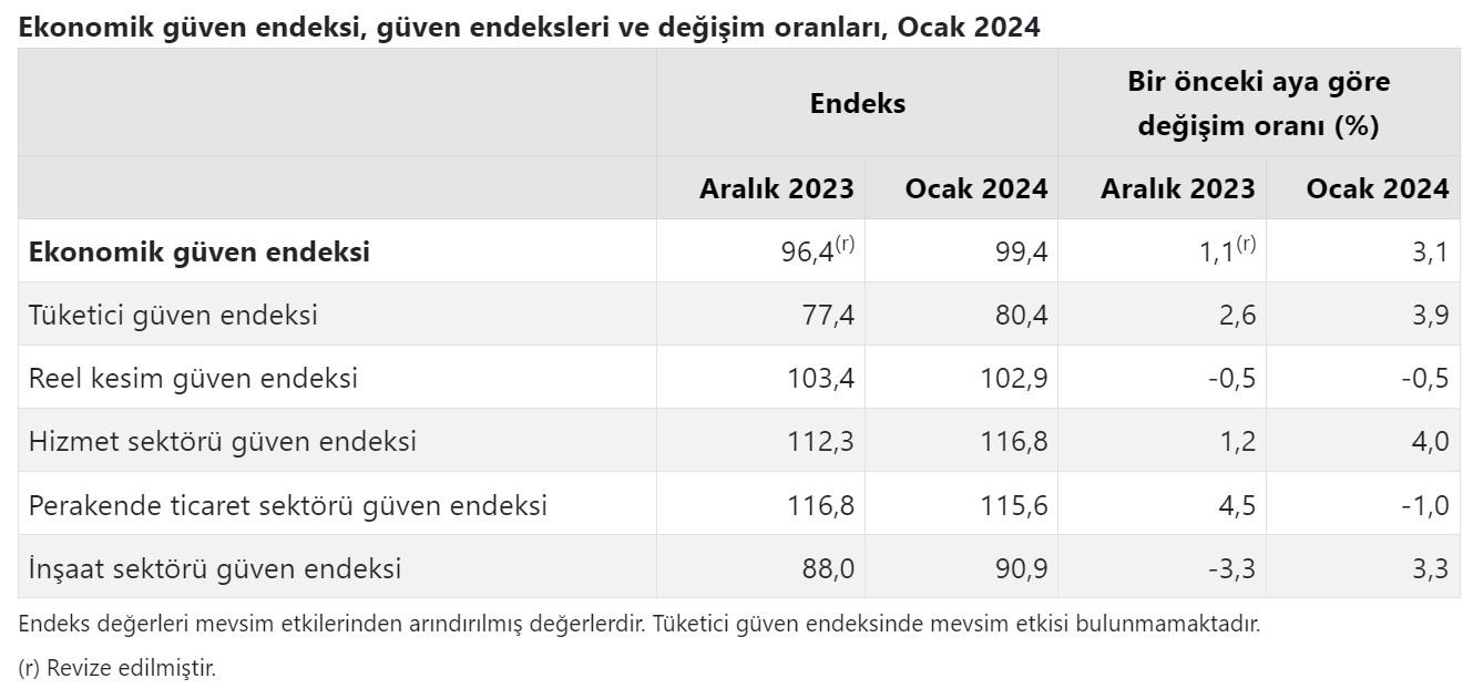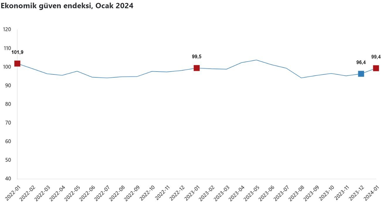 TÜİK'e göre ekonomik güven endeksi geçen yılın aralık ayında 96,4 iken 2024’ün Ocak ayında yüzde 3,1 oranında artarak 99,4 değerini aldı. Alt endekslerden tüketici güveni ise artışa rağmen 80,4 değerini alabildi.