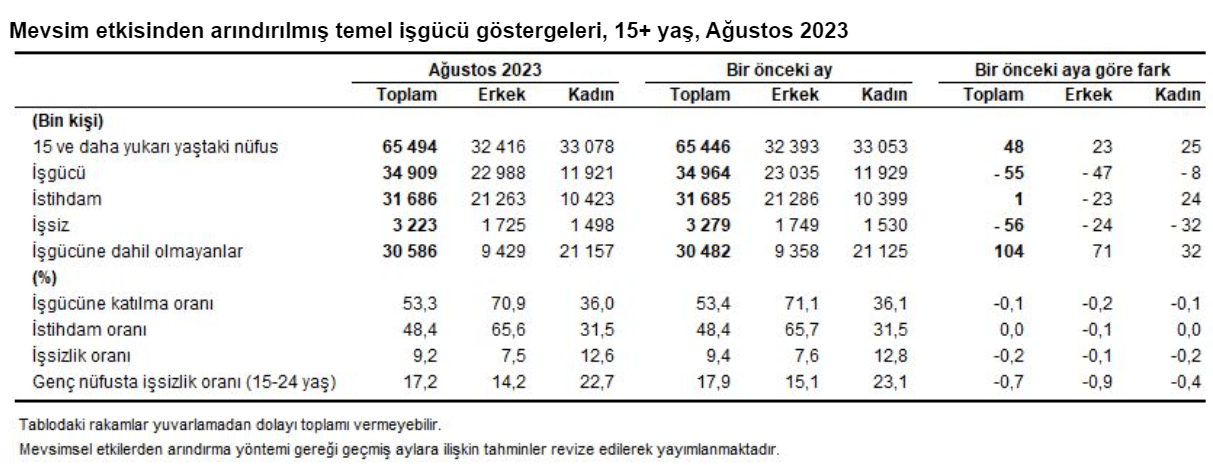 TÜİK’in Hanehalkı İşgücü Araştırması sonuçlarına göre 15 ve daha yukarı yaştaki kişilerde ‘işim yok’ diyenlerin sayısı 2023 yılı Ağustos ayında bir önceki aya göre 56 bin kişi azalarak 3 milyon 223 bin kişi oldu. İşsizlik oranı ise 0,2 puanlık düşüşle yüzde 9,2 oldu. İşsizlik oranı erkeklerde yüzde 7,5 iken kadınlarda yüzde 12,6 olarak tahmin edildi.