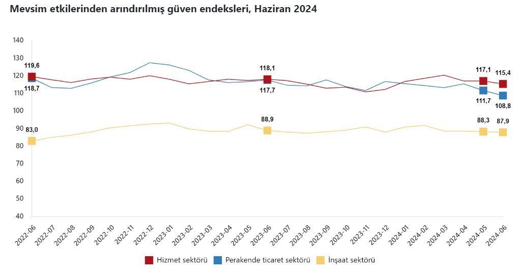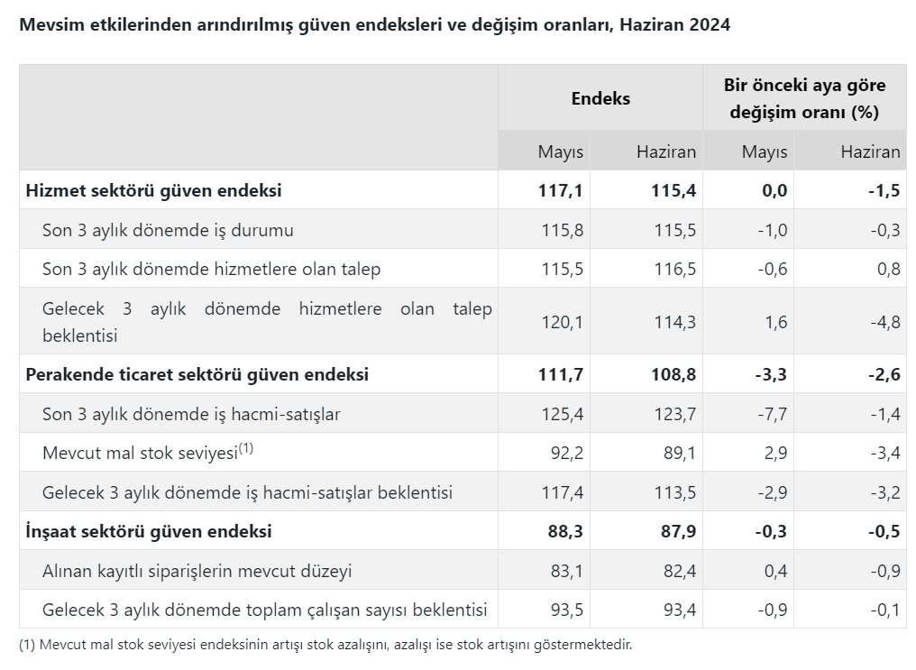 Ekonomide sıkılaştırma politikaları nedeniyle haziranda güven endeksi hizmet sektöründe yüzde 1,5, perakende ticarette yüzde 2,6, inşaatta ise yüzde 0,5 azaldı. Tek sınırlı artış hizmet sektöründe üç aylık dönemde hizmetlere yönelik talepte oldu.