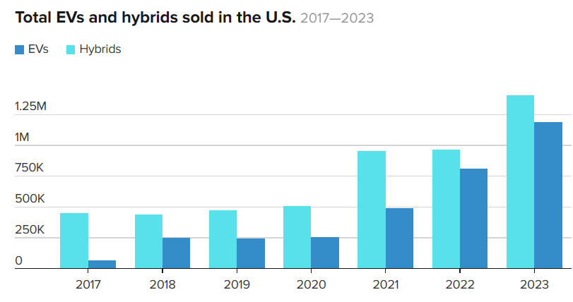 Cox Automotive’in tahminlerine göre ABD’de elektrikli araç satışları geçen yıl 1,2 milyon adetle rekor kırdı ve bu rakam toplam ulusal pazarın yüzde 7,6’sını temsil ediyor. Analistlerin tahminlerine göre bu payın on yılın sonunda yüzde 30 ila yüzde 39’a yükselmesi bekleniyor.