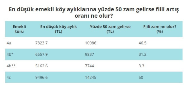 Bu durumda yüzde 50 zam yapılsa bile maaşlar gerçekte ne kadar artıyor? 4a’daki artış oranı yüzde 46,5. 4b’nin ilk grubunda artış oranı yüzde 31,2 iken diğer grupta sadece yüzde 3.3 oluyor. 4c’deki fiili artış oranı da yüzde 50’ye tekabül ediyor. Eğer hükümet 7 bin 500 olan “takviyeli” maaşı güncellemez ise özellikle 4b’deki emeklileri büyük bir hüsran bekliyor. Zam oranının yüzde 45’in altında kalması durumunda ise 4b’de kök aylıkları 5 bin 163 lira olan emeklilerin maaşı fiilen artmayacak.