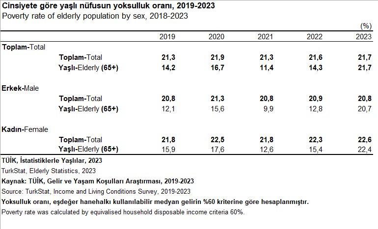 Türkiye İstatistik Kurumu TÜİK, 65 yaş üstü nüfusta yoksulluğun yüzde 14,3'ten bir yılda yüzde 21,7'ye fırladığını açıkladı. Artış oranı yüzde 51,7. Yaşlı yoksul sayısındaki bu hızlı artışın sebebi, emekli maaşlarına yapılan düşük zam.