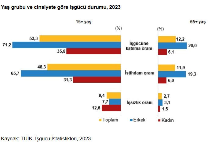 İşgücü istatistiklerine göre, işgücüne katılma oranı 2019 yılında 15 ve daha yukarı yaştaki nüfus için yüzde 53,0 iken 2023 yılında yüzde 53,3 oldu. Bu oran yaşlı nüfus için 2019 yılında yüzde 12,0 iken 2023 yılında yüzde 12,2 oldu.