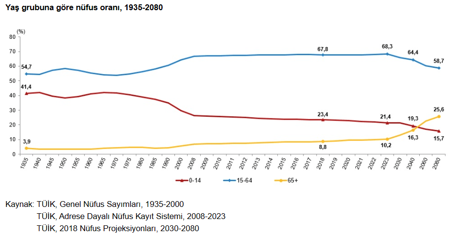 İstatistiklere göre yaşlı nüfus olarak kabul edilen 65 ve daha yukarı yaştaki nüfus, 2018 yılında 7 milyon 186 bin 204 kişi iken son 5 yılda yüzde 21,4 artarak 2023 yılında 8 milyon 722 bin 806 kişi oldu. Yaşlı nüfusun toplam nüfus içindeki oranı ise 2018 yılında yüzde 8,8 iken, 2023 yılında yüzde 10,2’ye yükseldi. Yaşlı nüfusun 2023 yılında yüzde 44,5’ini erkek nüfus, yüzde 55,5’ini kadın nüfus oluşturdu. Nüfus projeksiyonlarına göre yaşlı nüfus oranının 2030 yılında yüzde 12,9, 2040 yılında yüzde 16,3, 2060 yılında yüzde 22,6 ve 2080 yılında yüzde 25,6 olacağı öngörüldü.