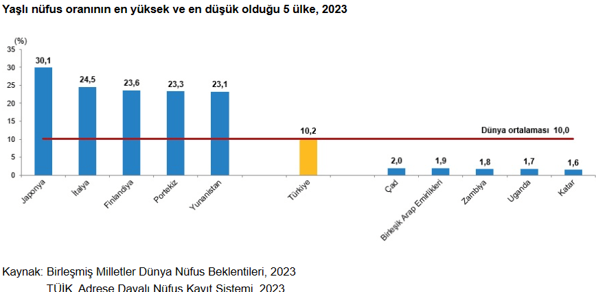 Bu tahminlere göre dünya nüfusunun yüzde 10,0’ını yaşlı nüfus oluşturdu. En yüksek yaşlı nüfus oranına sahip ilk üç ülke sırasıyla yüzde 30,1 ile Japonya, yüzde 24,5 ile İtalya ve yüzde 23,6 ile Finlandiya oldu. Türkiye, 184 ülke arasında 67. sırada yer aldı.