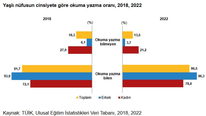 Yaşlı nüfus içinde okuma yazma bilenlerin oranı 2018 yılında yüzde 81,7 iken 2022 yılında yüzde 86,5 oldu. Okuma yazma bilmeyen yaşlı nüfus oranı 2018 yılında yüzde 18,3 iken 2022 yılında yüzde 13,5 oldu. Okuma yazma bilmeyen yaşlı kadınların oranının, 2022 yılında yaşlı erkeklerin oranından 5,7 kat fazla olduğu görüldü. Okuma yazma bilmeyen yaşlı kadınların oranı yüzde 21,2 iken yaşlı erkeklerin oranı yüzde 3,7 oldu.