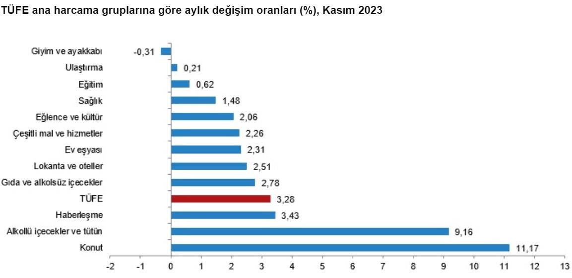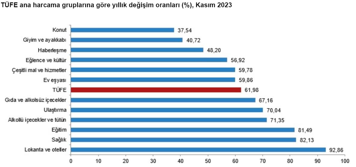 Ana harcama grupları itibariyle 2023 yılı kasım ayında bir önceki aya göre en az artış gösteren ana grup yüzde -0,31 ile giyim ve ayakkabı oldu. Buna karşılık 2023 yılı kasım ayında bir önceki aya göre artışın en yüksek olduğu ana grup yüzde 11,17 ile konut oldu. Sürekli zamlarla içki ve sigarada fiyatların yüzde 9,16 oranında arttığı alkollü içecekler ve tütün ana harcama grubu fiyatların en çok yükseldiği iki gruptan biri oldu.