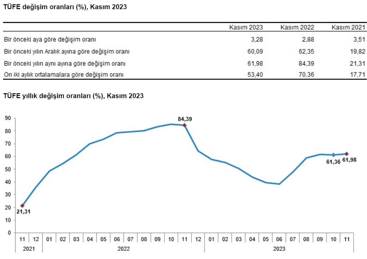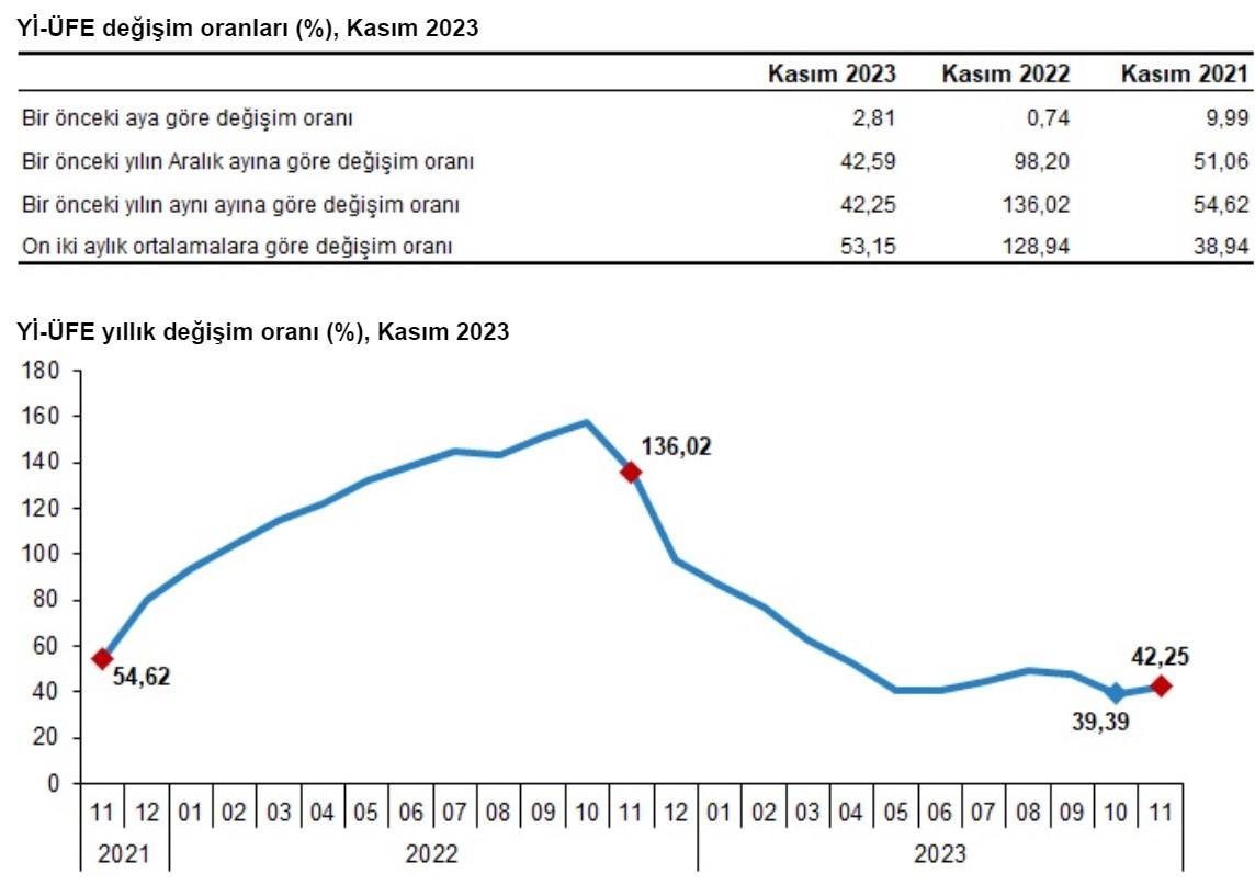 Türkiye İstatistik Kurumu’na (TÜİK) göre Yurt İçi Üretici Fiyat Endeksi (Yİ-ÜFE) 2023 yılı Kasım ayında bir önceki aya göre yüzde 2,81, bir önceki yılın Aralık ayına göre yüzde 42,59, bir önceki yılın aynı ayına göre yüzde 42,25 ve on iki aylık ortalamalara göre yüzde 53,15 arttı. Üretici enflasyonu kasımda aylık bazda yüzde 1,94 artarken yıllık bazda yüzde ise yüzde 39,39 olmuştu.