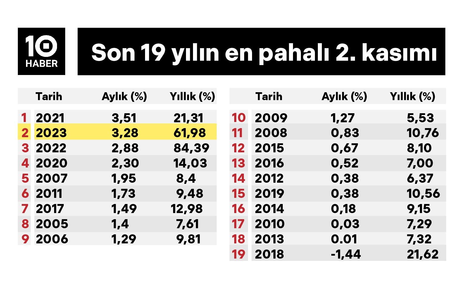 Tüketici enflasyonu kasımda bir önceki aya göre yüzde 3,28 oranında arttı. Yıllık artış da yüzde 61,98 oldu. Enflasyondaki hafif düşüşe rağmen son 19 yılın en pahalı ikinci kasım ayını yaşadık.