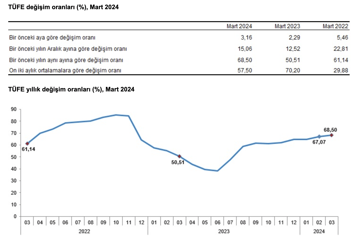 -Yİ-ÜFE Mart ayında yüzde 3,29 oranında arttı ve Yİ-ÜFE yıllık artış oranı yüzde 51,47 olarak gerçekleşti.