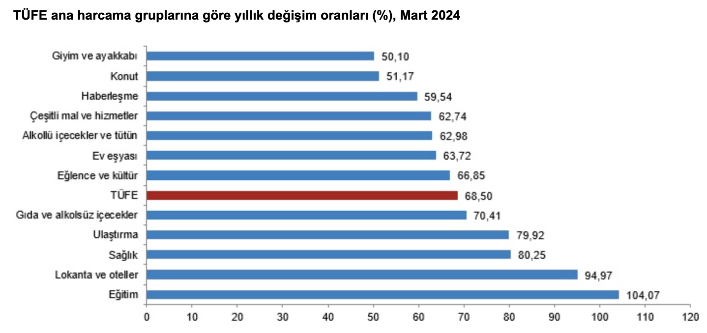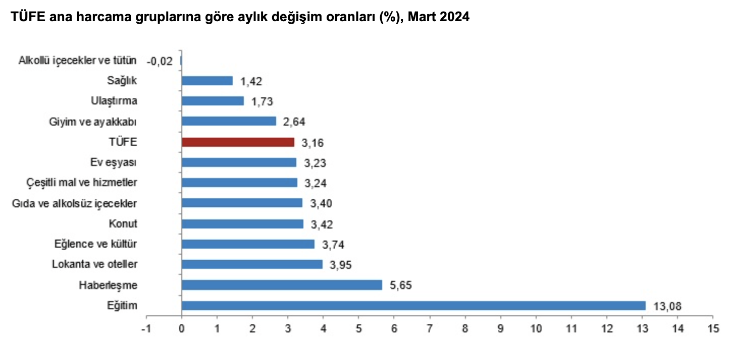 Ana harcama grupları itibarıyla 2024 yılı Mart ayında bir önceki aya göre azalan ana grup yüzde 0,02 ile alkollü içecekler ve tütün oldu. Buna karşılık, 2024 yılı Mart ayında bir önceki aya göre artışın en yüksek olduğu ana grup ise yüzde 13,08 ile eğitim oldu.