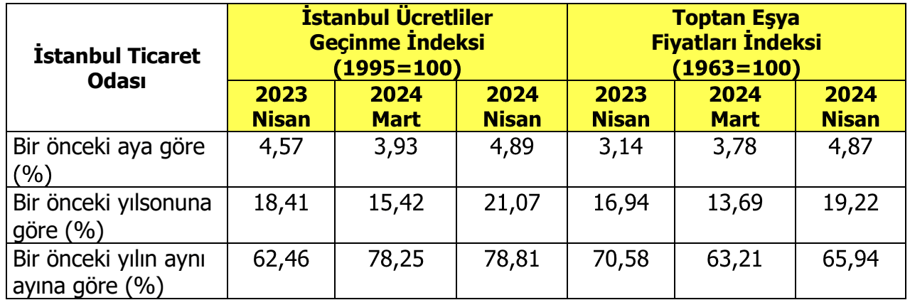İstanbul Ticaret Odası’nın (İTO) 1995 bazlı Ücretliler Geçinme İndeksi yıllık bazda yüzde 78,81, Toptan Eşya Fiyatları İndeksi ise yüzde 65,94 olarak gerçekleşti. Mart ayında ise Ücretliler Geçinme İndeksi’ndeki yıllık artış yüzde 78.25; Toptan Eşya Fiyatları İndeksi’ndeki yıllık artış ise 63,21 olarak gerçekleşti. İTO’nun tüketici ve toptan eşya fiyatlarındaki değişime ilişkin verileri hükümetin “enflasyonun mayısta zirve yapacağına” ilişkin beklentisiyle paralel bir seyir izliyor.