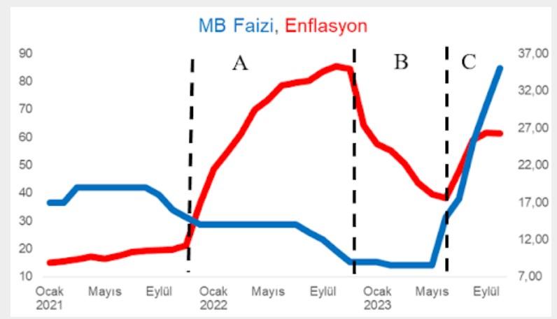 Enflasyonun (TÜFE) ve Merkez bankası politika faizinin 2021 Ocak ayından 2023 Ekim ayına kadar birlikte çizdiği grafiği daha önce paylaşmıştım. Bu grafiği bir kez daha paylaşayım (sol eksen enflasyonu, sağ eksen Merkez Bankası politika faizini gösteriyor.) Dikkat edilecek olursa 2021 yılının Eylül ayında başlayan faiz indirimlerinin sonrasında enflasyonda hızlı bir yükseliş başlıyor. Bu yükseliş A bölgesinde yer alıyor. Bu bölgede faiz düşürülmeye devam ediyor. B bölgesinde faiz düşük kalmaya devam ettiği halde enflasyon da düşüşe geçiyor. C bölgesinde enflasyon yeniden yükselişe geçiyor ve bu kez faiz de yükseliyor.