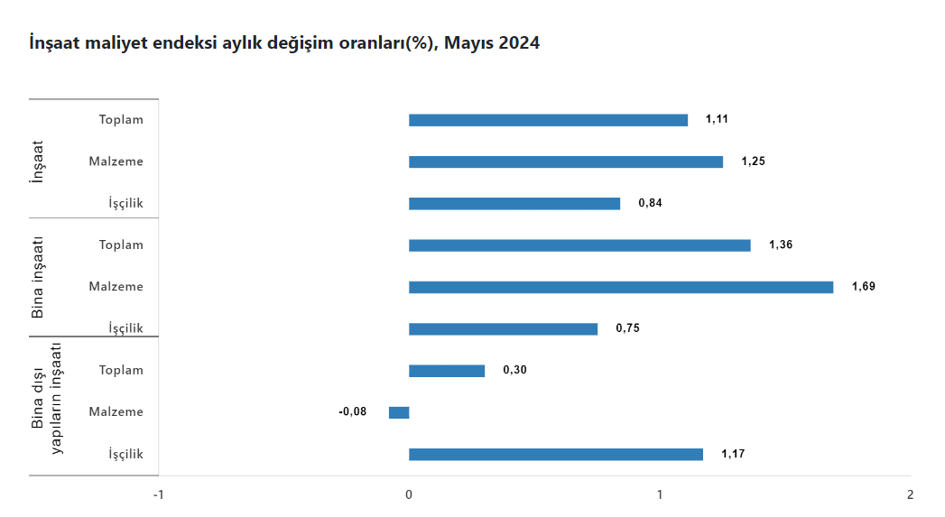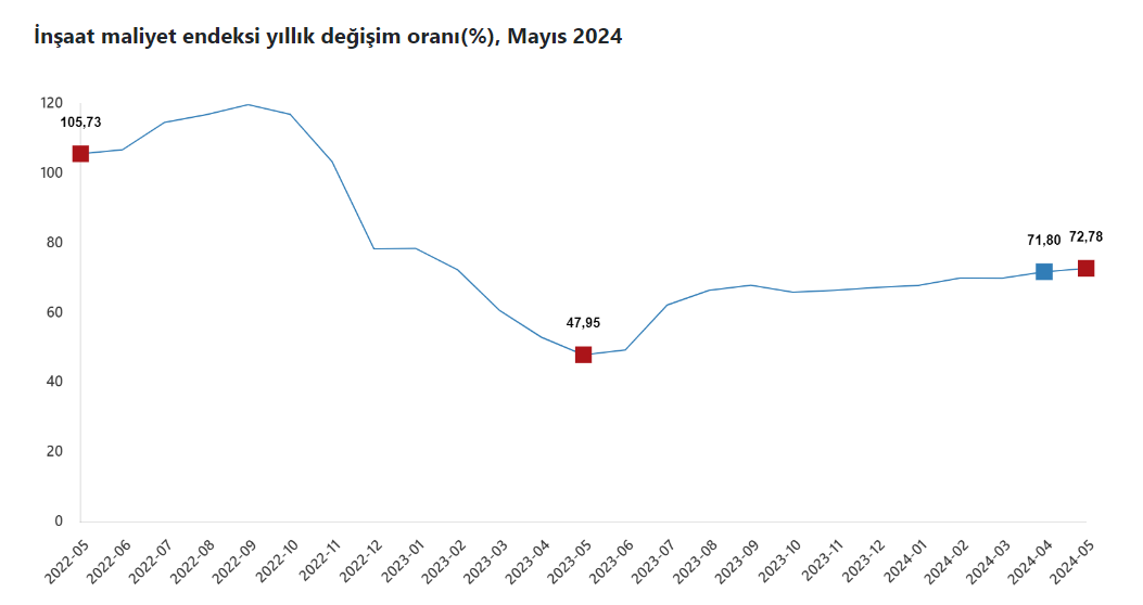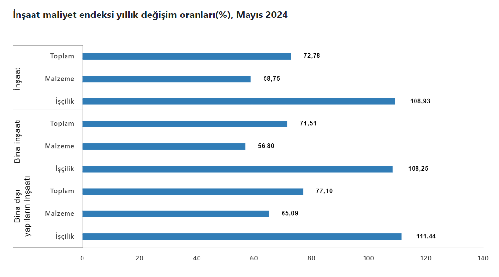 Türkiye İstatistik Kurumu (TÜİK) tarafından yayımlanan verilere göre inşaat maliyet endeksi 2024 yılı Mayıs ayında bir önceki aya göre yüzde 1,11, bir önceki yılın aynı ayına göre yüzde 72,78 arttı. Bir önceki aya göre malzeme endeksi yüzde 1,25, işçilik endeksi yüzde 0,84 arttı. Ayrıca bir önceki yılın aynı ayına göre malzeme endeksi yüzde 58,75 işçilik endeksi yüzde 108,93 arttı.