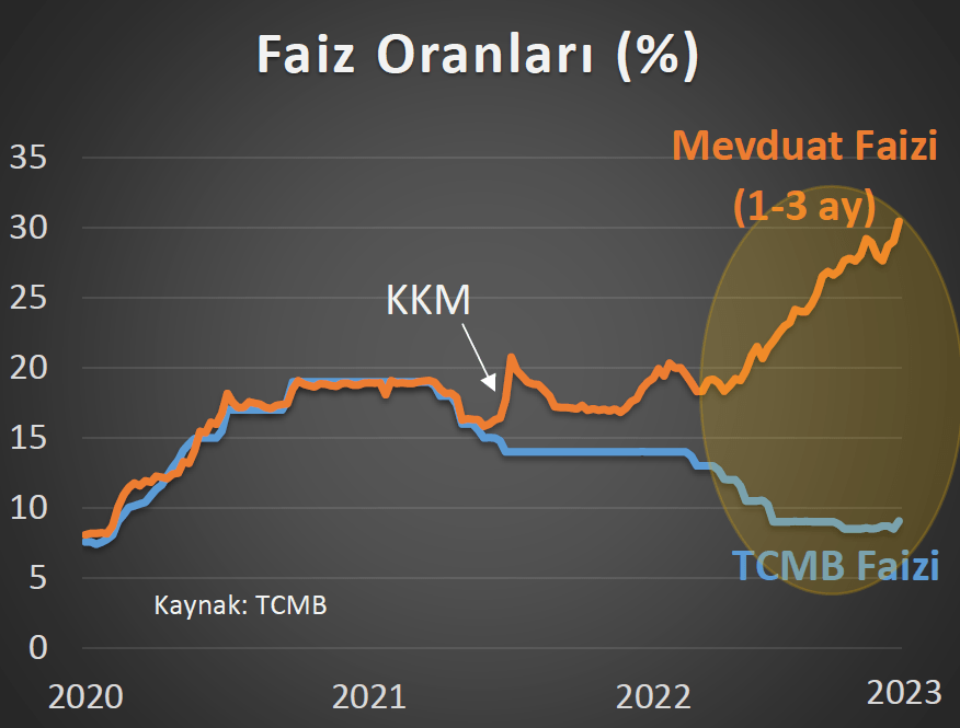 Bu arada haberin ardından Merkez Bankası eski Başekonomisti ve Bilkent Üniversitesi Öğretim Üyesi Prof. Dr. Hakan Kara, Twitter hesabından yaptığı açıklamada, faizde oluşan farklı oranların yer aldığı tabloyu paylaşarak, “Faizler daha da düşecekmiş arkadaşlar, dağılabiliriz” dedi. Merkez Bankası’nın açıkladığı politika faizi yüzde 8,5’ken kur korumalı mevduata verilen yıllık faiz oranı yüzde 22’nin, 1-3 ay vadeli mevduatta ise yüzde 30’un üzerine çıkmış durumda.