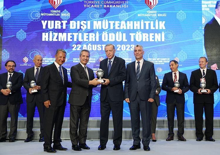 Dünyanın en büyük 250 uluslararası müteahhitliği listesinin 2022 yılı sonuçlarının belli olduğunu belirten Cumhurbaşkanı Erdoğan, Türkiye’den 42 firmanın girdiği bu listede yer alan müteahhitlere ödüllerinin verileceğini, dünyanın en büyük 225 uluslararası teknik müşavirliği listesinde yer alan 6 firmanın ödüllerinin de takdim edileceğini aktardı. Erdoğan ödül verilecek firmaları ve temsilcilerini tebrik ederek, “Rabbimden önümüzdeki sene çok daha fazla sayıda firmamıza ödüllerini takdimi bize nasip etmesini diliyorum” dedi.