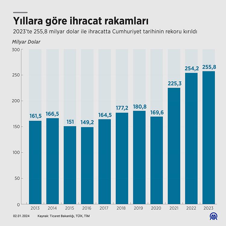 Cumhurbaşkanı Erdoğan '2023 yılı ihracatımız geçen yıla göre yüzde 0,6 artışla 255,8 milyar dolar olarak rekor kırdı. Yıllık ithalat yüzde 0,5 düşüşle 361,8 milyar dolar oldu. Dış ticaret açığı ise yüzde 3,2 gerileyerek 106 milyar dolara indi' dedi.