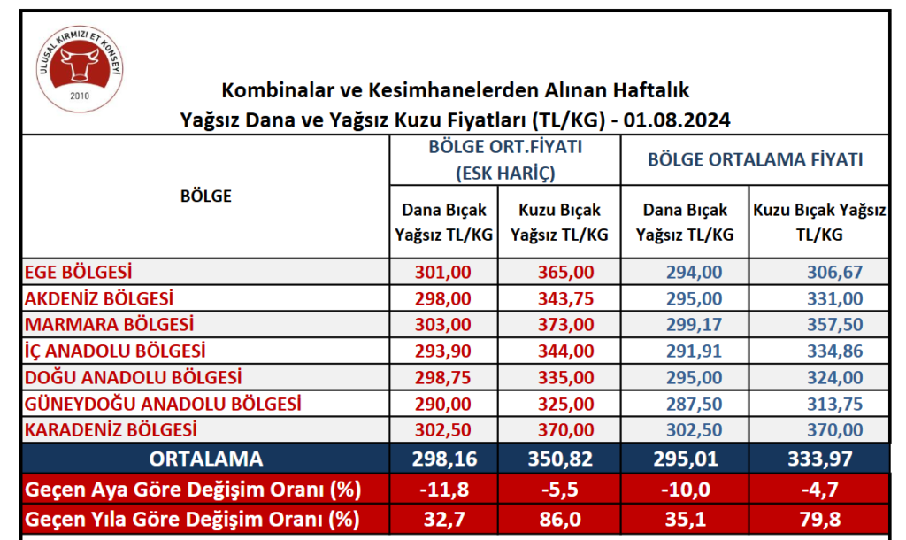 Türkiye’de satılan karkas et fiyatlarını haftalık olarak yayınlayan Ulusal Kırmızı Et Konseyi’nin verileri, kırmızı et fiyatlarının 1 Ağustos’ta düştüğünü ancak 22 Ağustos’ta yeniden yükseldiğini gösteriyor. Buna göre 1 Ağustos’ta karkas dana etinin kilosu temmuz ayına göre yüzde 10 düşüşle 295 liraya, kuzu etinin kilosu ise yüzde 4,7 düşüşle 333,97 TL’ye indi.