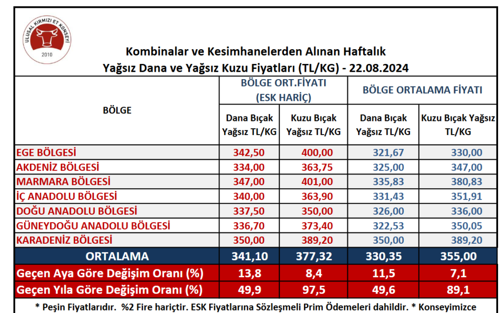 Ancak 22 Ağustos verilerine göre, 330,35 TL’den satılan karkas dana etinin kilosu geçen aya göre yüzde 11,50, kilosu 355 liradan satılan kuzu eti ise yüzde 7,10 arttı.