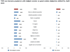 Bu aya bakıldığında, yıllık enflasyonu en fazla belirleyen iki etmen göze çarpıyor: Yıllık yüzde 51,36 artan konut fiyatları ve yıllık 36,06 artan gıda fiyatları. Bu iki gruptaki fiyat artışları, yıllık yüzde 33,29’luk enflasyonun yüzde 16,45’inden sorumlu.